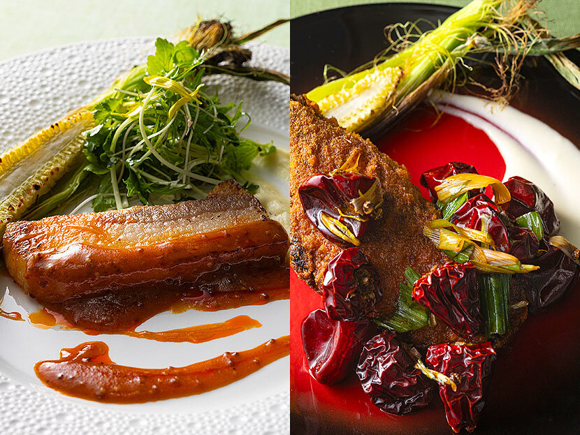 점심 코스의 「홋카이도산 돼지의 곡물 겨자 소스 볶음」(사진 왼쪽)은, 곡물 겨자와 라유를 합친 소스가, 단맛이 있는 돼지고기의 맛을 돋보이게 합니다. 디너 코스에서 선택하실 수있는 "램 고기의 사천 고추 볶음 커민 맛"(사진 오른쪽)은 육즙이 부드러운 럼고기에 사천 고추와 커민의 상쾌한 매운 맛이 조화로운 향기로운 일품입니다.
