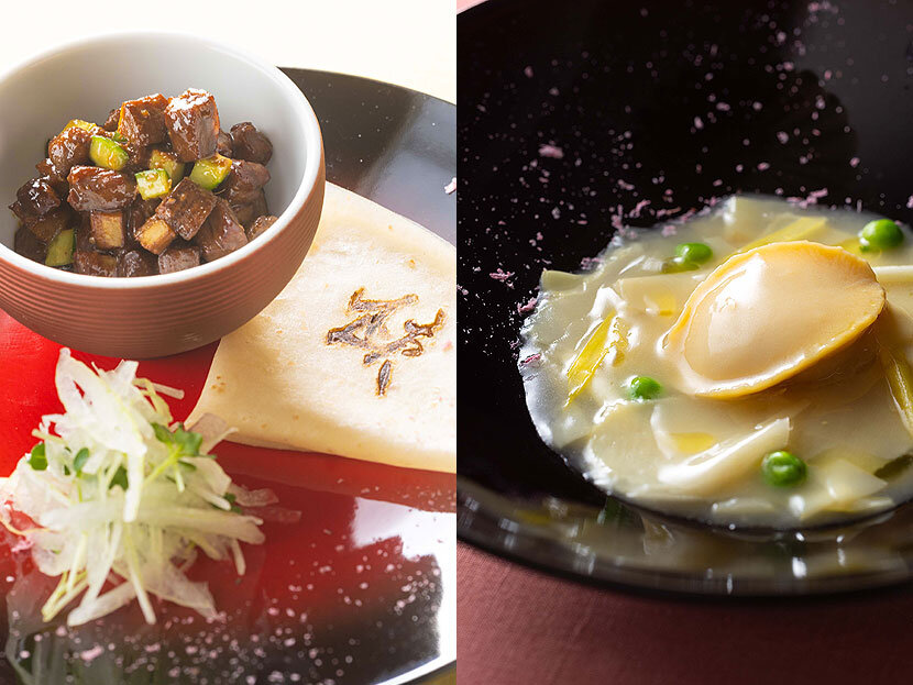 ランチコースの「長崎県産黒毛和牛と牛蒡の甘味噌炒め」(写真左)は、ジューシーな口どけの黒毛和牛に牛蒡やきゅうりを合わせた、肉の旨みと食感を楽しめる一品。ディナーコースで登場する「福岡県産"合馬のたけのこ"と鮑の煮込み」(写真右)は、たけのこやグリーンピースを柔らかく風味豊かな鮑と合わせ、その優しい味わいはもちろん、見た目にも春らしさを演出します。