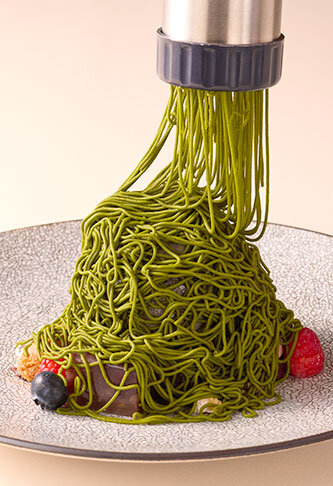 손님의 눈앞에서 크림을 짜고 마무리하는 인기의 「시보리 갓 몽블랑」이, 기간 한정으로 품위있는 향기의 말차 크림을 이용한 "화"의 테이스트로 등장!