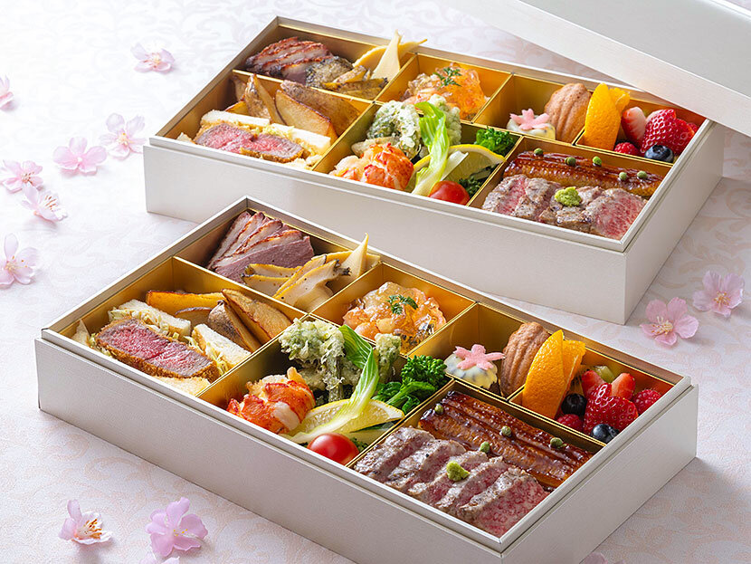 전채부터 디저트까지, 정평 인기 메뉴나, 봄 특유의 식재료를 이용한 일품을 담은, 호화스러운 도시락입니다. 「오리와 연어의 냉채」나 「오마르 새우의 프리츄르」등 고급 식재료 외, 메인의 「흑모 와규 스테이크중・우나중」, 「흑모 와규 히레카츠 샌드」등 볼륨도 충분. 외형에도 즐겁고, 색채도 맛도 풍부한 도시락으로 완성했습니다.