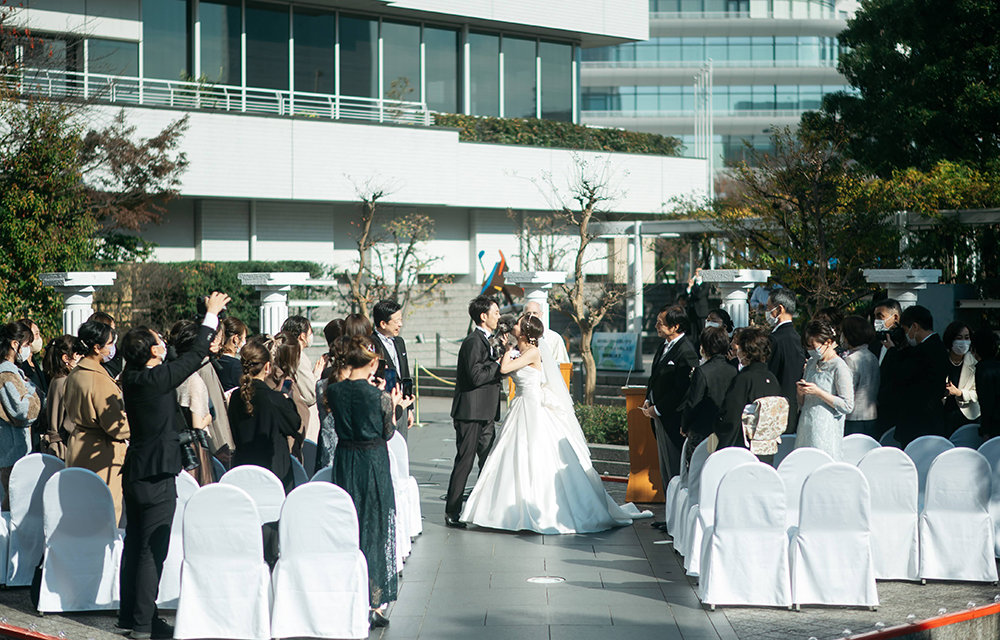 屋外での挙式というのはあまり多くありませんが、とても新鮮で、天気にも恵まれ、家族・親戚・友人のみんなが満足してくれて、好評でした。